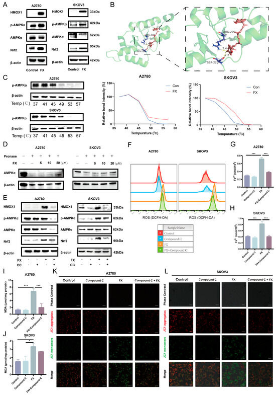AMPK inhibition can reverse the FX-induced ferroptosis of OC cells. (A) The expression of p-AMPK, AMPK, Nrf2, and HMOX1 in A2780 and SKOV3 cells. (B) The interaction between FX and AMPK was predicted by molecular docking. (C) CETSA showed AMPK target engagement by FX in ovarian cancer cells. (D) The protein expression of AMPK of DARTS. Treatment with pronase was conducted for 30 min. Western blot results using anti-AMPK and anti-actin antibodies. The DARTS assay shows that FX protects AMPK, but not actin, from degradation. (E) The expression of p-AMPK, AMPK, Nrf2, and HMOX1 in OC cells, subjected to FX and Compound C (CC). (F) Intracellular ROS levels of OC cells after FX and CC treatment. (G,H) Fe2+ levels were detected in OC cells, respectively. (I,J) MDA was analyzed using commercial detection kits. (K,L) Intracellular fluorescence of JC-1 in OC cells for the detection of MMP. Scale bar = 20 μm. * p < 0.05, *** p < 0.001 vs. control group.