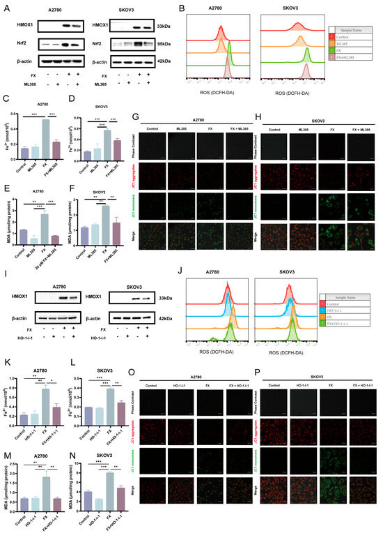 Nrf2 inhibition and HMOX1 inhibition can reverse the FX-induced ferroptosis of OC cells. (A) The levels of Nrf2 and HMOX1 in A2780 and SKOV3 cells, subjected to FX and ML385. (B) Intracellular ROS levels of OC cells after FX and ML385 treatment. (C,D) Fe2+ expression was detected in A2780 and SKOV3 cells, respectively. (E,F) MDA was analyzed using commercial detection kits. (G,H) Intracellular fluorescence of JC-1 in OC cells for the detection of MMP. (I) The levels of HMOX1 in A2780 and SKOV3 cells, subjected to FX and HO-1-i-1. (J) Intracellular ROS levels of OC cells after FX and HO-1-i-1 treatment. (K,L) Fe2+ expression was detected in A2780 and SKOV3 cells, respectively. (M,N) MDA was analyzed using commercial detection kits. (O,P) Intracellular fluorescence of JC-1 in OC cells for the detection of MMP. Scale bar = 20 μm. * p < 0.05, ** p < 0.01, *** p < 0.001 vs. control group.