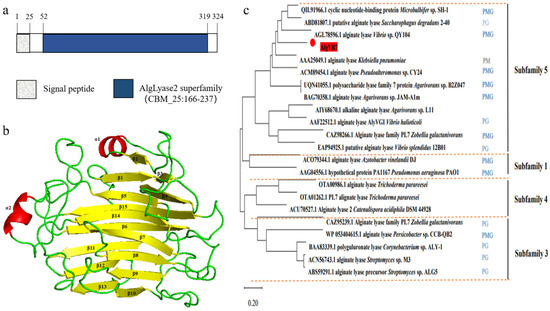 Figure 1. Sequence analysis of the alginate lyase AlgVR7 from Vibrio rumoiensis. (a) Schematic domain diagram of AlgVR7. (b) The overall structure of AlgVR7 predicted with AlphaFold. Enzymes highlighted in yellow are structure-solved 2. (c) Phylogenetic analysis of AlgVR7 and other PL7 lyases from different subfamilies. The subfamily and the substrate specificity are marked in red numbers and blue annotations according to the CAZy database. AlgVR7 is highlighted in red.