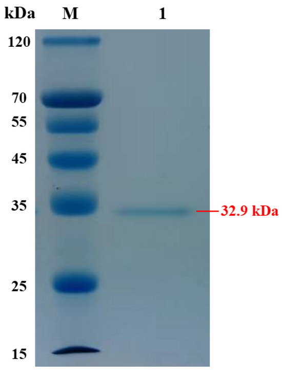 The mature AlgVR7, without the signal peptide, was expressed in E. coli, and a single band was obtained after purification, as shown on a polyacrylamide gel (Figure 3). The molecular mass of AlgVR7 was approximately 32.9 kDa, as evidenced by the protein ladder. The protein bands exhibited a single, impurity-free band suitable for subsequent experiments.