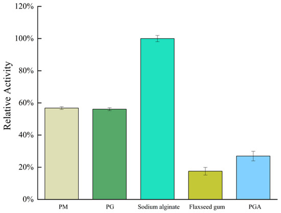 AlgVR7’s activity patterns against various substrates, such as PM, PG, sodium alginate, flaxseed gum, and PGA (Figure 4), indicate effective functioning. AlgVR7 exhibits maximum activity on sodium alginate (100%), 60% on PM and PG, 25% on PGA, and 20% on flaxseed gum.