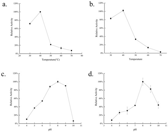 Figure 5. Enzymatic characterization of recombinant AlgVR7. (a) The optimal temperature of AlgVR7. Reactions were conducted in 50 mM PBS buffer (pH 8.0) at different temperatures for 20 min. (b) The effect of temperature on the stability of AlyVR7. AlyVR7 was incubated at different temperatures for 120 min, and the residual activities were measured at 40 °C and pH 8.0. (c) The optimal pH of AlgVR7. Reactions were conducted at 40 °C for 20 min in 50 mM PBS buffer over a pH range from 4.0 to 10.0. (d) The pH stability of AlgVR7. After incubating the enzyme in buffers of various pH at 4 °C for 24 h, the residual enzyme activities were measured in 50 mM PBS buffer (pH 8.0) at 40 °C. The highest activity was set to be 100%. Each value represents the mean of three replicates ± standard deviation.