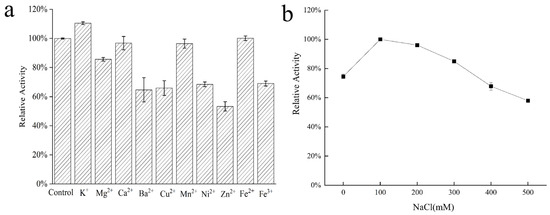 The AlgVR7 was incubated with different additives at 40 °C for 1 h, and the residual enzyme activities were measured to examine their effects on AlgVR7’s stability under the most suitable conditions. The additives at 1 mM included various metal ions such as Na+, K+, Ca2+, Mg2+, Fe2+, Cu2+, Co2+, Mn2+, Ba2+, Cd2+, and Zn2+. The stability of AlgVR7 was evaluated by exposing the enzyme to a high concentration of NaCl (0–500 mM) at 40 °C for 1 h. The enzyme activities for the treatments were normalized to the control without any addition (100%).