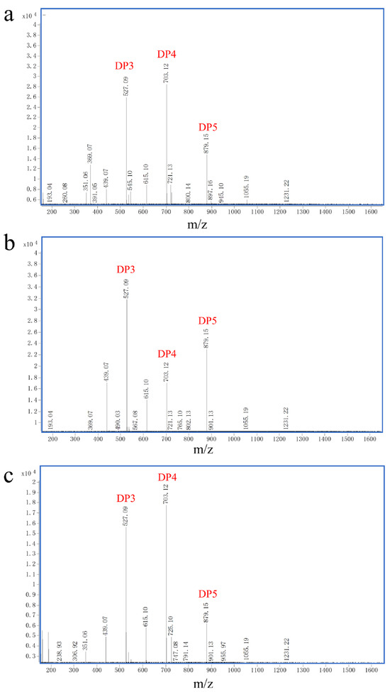 Figure 7. Hydrolysates from different substrates were analyzed using ESI-MS. ESI-MS analysis of hydrolysis products with (a) polyM used as the substrate, (b) polyG used as the substrate, and (c) sodium alginate used as the substrate.
