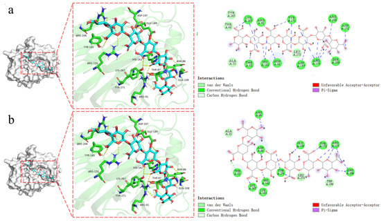 Figure 8. Molecular docking and clarifying catalytic residues of AlgVR7. (a) Surface representation of the binding site of PG7 in AlyVR7 (indicated by the stick, drawn in blue). Key residues (drawn in green) interacting with the PG7. Surface representation of the binding site of PG7 in AlyVR7 for 2D. (b) Surface representation of the binding site of PGA7 in AlyVR7 (indicated by the stick, drawn in purple). Key residues (drawn in green) interacting with thePGA7. Surface representation of the binding site of G4 in AlyVR7 for 2D.