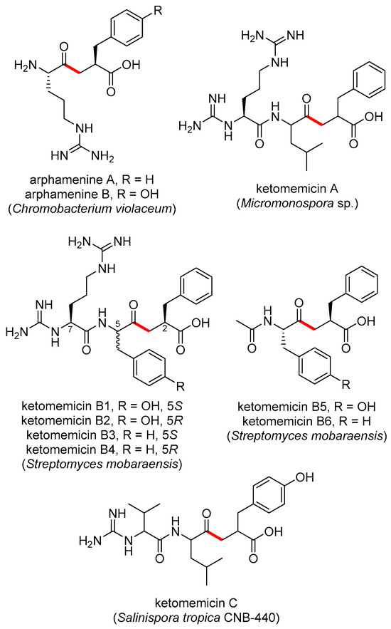 - Kawata, J.; Naoe, T.; Ogasawara, Y.; Dairi, T. Biosynthesis of the carbonylmethylene structure found in the ketomemicin class of pseudotripeptides. Angew. Chem. Int. Ed. 2017, 56, 2026–2029. [Google Scholar] [CrossRef]