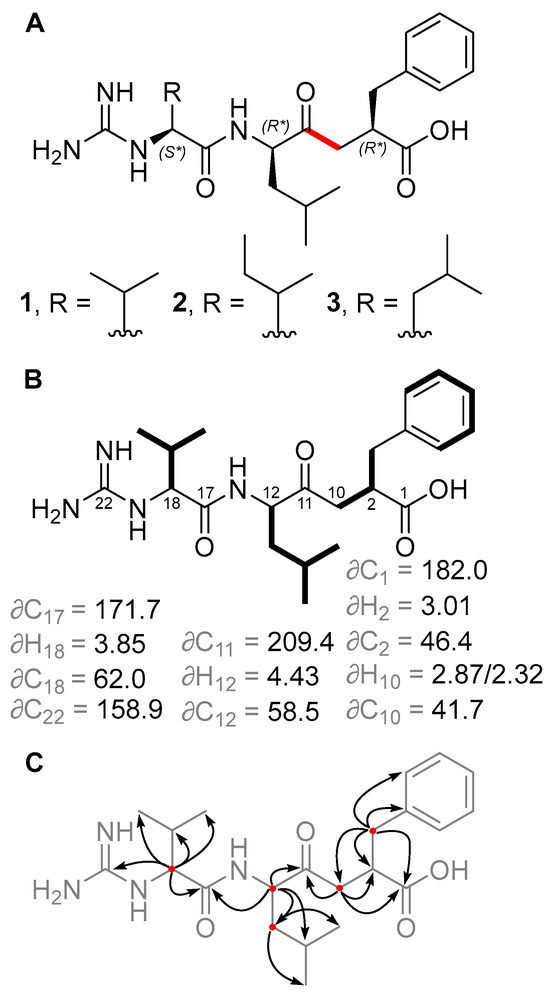 (A) Structures of new ketomemicins (1–3) isolated in this work (ketomethylene bond in red). (B) 1H and 13C NMR chemical shifts (in ppm) of backbone atoms and 1H–1H COSY correlations (bolded bonds) observed for 1. (C) Key HMBC correlations observed for 1 represented as arrows from 1H to 13C atoms.
