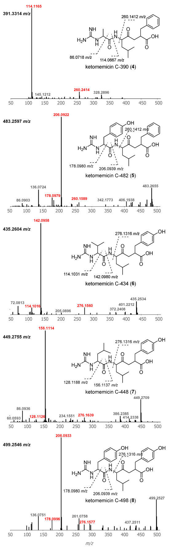 Structures and MS2 spectra of ketomemicins 4–8. Characteristic mass fragments (in red) putatively arise from the cleavage of bonds crossed with dashed lines. Precursor masses are shown for each spectrum (top-left).