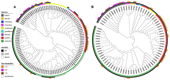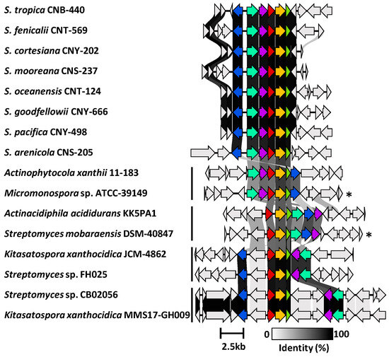 - Román-Ponce, B.; Millán-Aguiñaga, N.; Guillen-Matus, D.; Chase, A.B.; Ginigini, J.G.M.; Soapi, K.; Feussner, K.D.; Jensen, P.R.; Trujillo, M.E. Six novel species of the obligate marine actinobacterium Salinispora, S. cortesiana sp. nov., S. fenicalii sp. nov., S. goodfellowii sp. nov., S. mooreana sp. nov., S. oceanensis sp. nov., and S. vitie sp. nov. Int. J. Syst. Evol. Microbiol. 2020, 70, 4668–4682. [Google Scholar] [CrossRef]