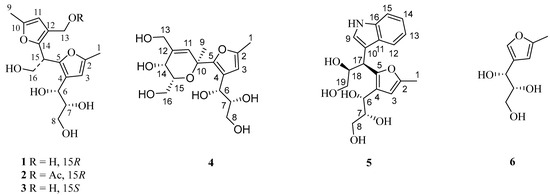 Compound 1, isolated as yellowish powder (methanol), was determined to have a molecular formula of C16H22O7 with six degrees of unsaturation, based on the analysis of its positive HRESIMS ion peak at m/z 349.1260 [M+Na]+. The careful examination of its 1H NMR data (Table 1 and Figure S1) revealed the presence of two aromatic protons at δH 5.97 (1H, s) and 5.97 (1H, s), as well as two methyl groups (δH 2.18 (3H, s) and 2.18 (3H, s)). Additionally, three oxygenated methylenes were observed [δH 3.09 (1H, m), 3.25 (1H, m), 3.80 (2H, dd, J = 5.5, 7.5 Hz), and 4.20 (2H, d, J = 5.5 Hz)], along with three methines, including two oxygenated ones at δH 3.37 (1H, m), 4.36 (1H, J = 6.5, 4.6 Hz), and 4.34 (1H, t, J = 7.6 Hz). The analysis of the 13C NMR data (Table 1 and Figure S2) of 1 revealed sixteen carbon signals, including two furan rings [δC 106.7, 107.5, 121.7, 122.7, 146.6, 146.6, 148.9, and 149.1]. Based on these findings and previous studies on the co-isolated antibiotic 2-methyl-4-(1-glycerol)furan (6) [13,14], compound 1 was identified as an analogue of the aforementioned antibiotic.