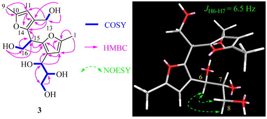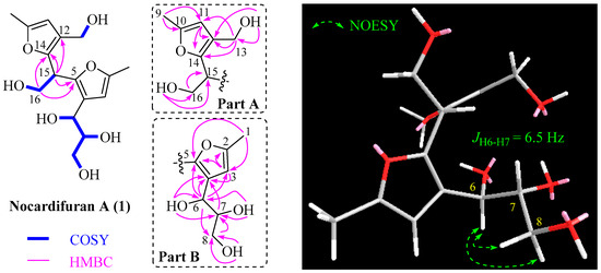 By analyzing the HSQC, COSY, and HMBC correlations (Figure 2), the planar structure of compound 1 was determined. In the COSY spectrum, four spin systems were observed as follows: a, 6-OH/H-6/H-7/H-8/8-OH; b, 7-OH/H-7; c, 16-OH/H-16/H-15; d, 13-OH/H-13. The HMBC correlations of H-11 with C-10, C-12, and C-14 confirmed the trisubstituted furan ring in part A. The presence of the methyl group at C-10 and the hydroxy methylene group at C-12 was confirmed by HMBC cross-peaks between Me-9 and C-10 and C-11, and those between H2-13 and C-11, C-12, and C-14. The HMBC cross-peaks of H-15 with C-12 and C-14 and those of H-16 with C-14 confirmed the attachment of C-15 to C-14, establishing the structure of part A. Moving on to part B, the HMBC analysis confirmed the positions of Me-1 to C-2 due to the correlations of H-3 with C-2, C-4, and C-5, and of Me-1 with C-2 and C-3. The 6,7,8-trihydroxypropyl moiety is attached to C-4 of the furan ring due to the correlations of H-6 with C-3, C-4, and C-5, and of H-7 with C-4. Finally, the correlations between H-15 and H-16 with C-5 indicated that part A was connected to part B through the methine carbon (C-15). Thus, the planar structure of compound 1 was elucidated accordingly.