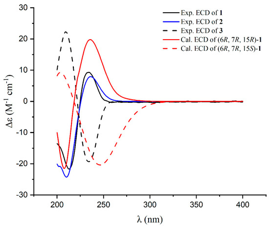 Experimental ECD spectra for 1–3 and calculated ECD spectra for 1.
