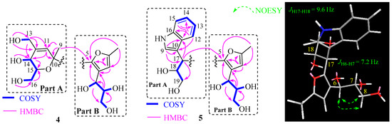 The 2D NMR correlations as shown in Figure 6 confirmed that part B of compound 5 was identical to the 2-methyl-4-(1-glycerol)furan. The indole ring of part A was confirmed through HMBC correlations. The attachment of the -CHCHOHCH2OH fragment to C-10 was supported by the 1H-1H COSY correlations of H-17/H-18/H19, as well as HMBC correlations between H-17 and C-9, C-10, C-18, and C-19. Finally, the key HMBC correlation between H-17 and C-5 confirmed the connection between part A to part B.