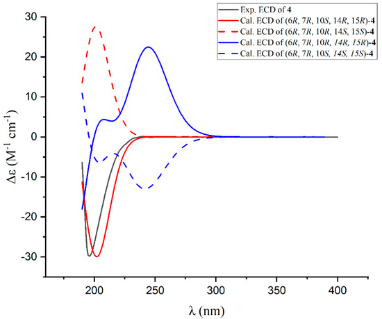 Additionally, the coupling constant between H-14 and H-15 (JH-14/H-15 = 2.0 Hz) suggests a cis configuration for these protons. To ascertain the absolute configurations of the pyran ring in compound 4, ECD calculations were employed for the four potential isomers (6R, 7R, 10S, 14R, 15R; 6R, 7R, 10R, 14S, 15S; 6R, 7R, 10R, 14R, 15R; 6R, 7R, 10S, 14S, 15S). Notably, the calculated ECD curve of (6R, 7R, 10S, 14R, 15R)-4 exhibited remarkable agreement with the experimental spectrum (Figure 7). This compelling correspondence unequivocally confirmed the absolute configuration of compound 4 as 6R, 7R, 10S, 14R, 15R, enhancing our understanding of its structural features.