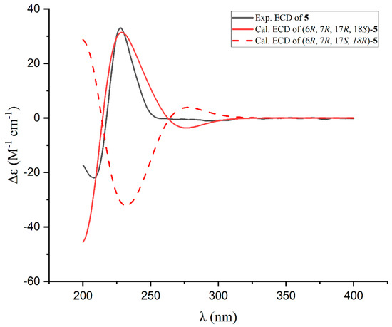 The coupling constant of H-17/H-18 (JH-17/H-18 = 9.6 Hz) indicated a threo configuration for these protons. To determine the absolute configurations of C-17 and C-18, ECD calculations were performed for two possible diastereomers: (6R, 7R, 17R, 18S)-5 and (6R, 7R, 17S, 18R)-5. The calculated ECD spectrum of (6R, 7R, 17R, 18S)-5 closely matched the experimental data (Figure 8), unambiguously establishing the 6R, 7R, 17R, 18S configuration. This confirms compound 5 as nocardifuran C.