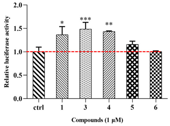 Compounds 1 and 3−6 (1 μM) activate FXR transactivation activity. * p < 0.05 versus control group, ** p < 0.01 versus control group, *** p < 0.001 versus control group (ctrl refers to the control group).