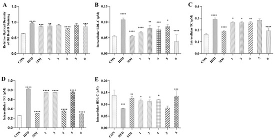 (A) Quantification analysis by Oil Red O staining. Intracellular LDL-C (B), TC (C), TG (D), and HDL-C (E). Data were the means ± standard deviation (SD) calculated by Prism, and each group was compared with HFD group; * p < 0.05, ** p < 0.01, *** p < 0.001, **** p < 0.0001 (one-way ANOVA). CON: Control group, which refers to the baseline or untreated group used for comparison in the experiment. HFD: High-fat diet, referring to the group fed a high-fat diet to induce conditions such as obesity and metabolic disorders. SIM: Simvastatin, a drug commonly used in research to evaluate its effects on lipid metabolism and related conditions.