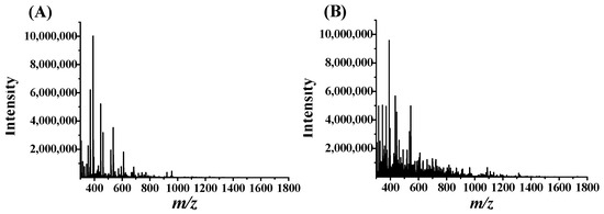 Total peak intensity chromatograms of the AUF filtrates from and Ciona intestinalis hydrolysates (A) and Styela clava hydrolysates (B), incubated with PD-L1.