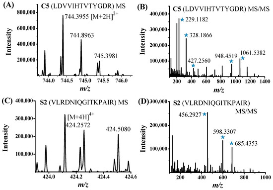 MS and MS/MS spectra of peptides C5 (A,B) and S2 (C,D). MS/MS fragment ions with m/z values that matched those of theoretical b and y fragment ions of the peptides were marked with asterisks.