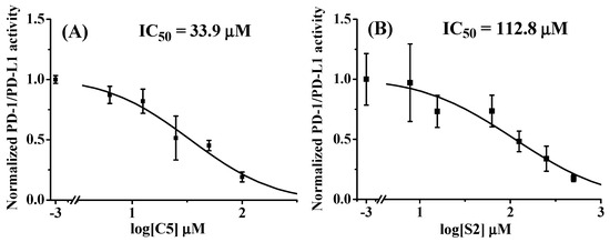 Inhibitory effects of C5 (A) and S2 (B) on PD-1/PD-L1 interaction with three repetitions for each concentration by the HTRF assays.