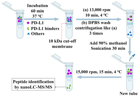 There have been no reports on the application of affinity ultrafiltration (AUF) methodology combined with nanoLC-MS/MS in screening for PD-1 or PD-L1 peptide inhibitors. AUF-nanoLC-MS/MS is expected to be a promising tool in high-throughput screening of peptide binders for a target protein. Using the AUF-nanoLC-MS/MS method, peptide binders to a protein are extracted based on the affinity of peptides to the target protein in a solution phase, and are identified using nanoLC-MS/MS. This method is easy to operate and highly efficient for extracting bioactive molecules from complex chemical substrates [49].