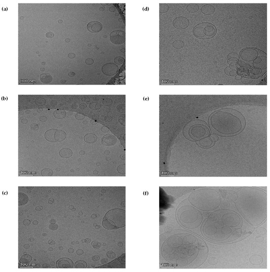 Cryo-transmission electron microscopy (cryo-TEM) images of the ultrastructure of fresh ((a–c), for pigment 1, 2, and 3, respectively) and rehydrated liposomes ((d–f), for pigment 1, 2, and 3, respectively) encapsulating astaxanthin (AX) from natural (pigment 1) and synthetic sources (pigment 2 and 3). Images were taken under low-dose conditions with a CETA-F camera.