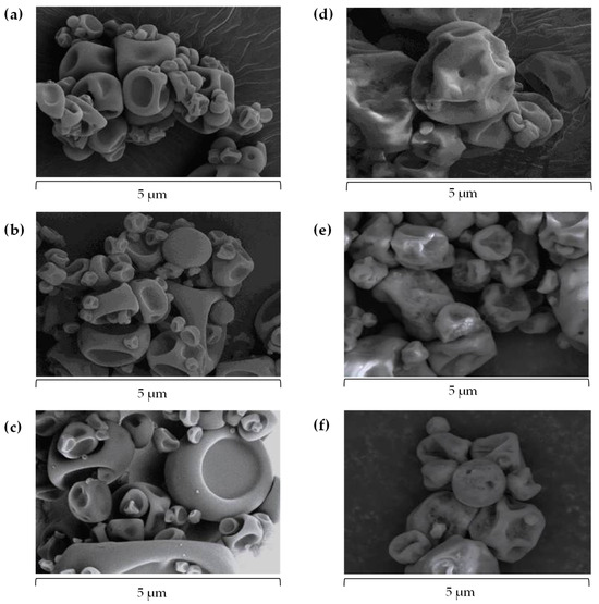 Scanning electron microscopy (SEM) images of the microstructure of astaxanthin (AX) microcapsules from natural (pigment 1) and synthetic (pigment 2 and 3) sources, encapsulated by spray-drying ((a–c), for pigment 1, 2, and 3, respectively) and liposome entrapment ((d–f), for pigment 1, 2, and 3, respectively). Images were captured at 5000× magnification.