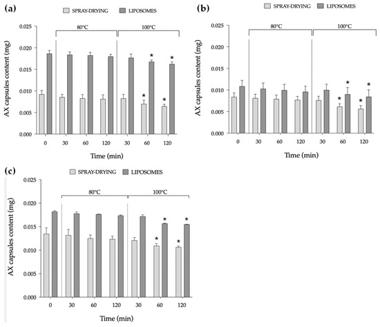 The temperature stability of encapsulated astaxanthin (AX) formulations from natural (pigment 1) and synthetic sources (pigment 2 and 3), encapsulated by spray-drying (dark grey) and liposome entrapment (light grey). Pigment 1 (a), pigment 2 (b), and pigment 3 (c) were exposed to two temperatures (80° and 100 °C) for 30, 60, and 120 min. Time 0 represents the original AX content of the capsules measured with the encapsulation efficiency (EE) after the encapsulation process. The results are reported as the mean ± standard deviation and expressed as mg of AX content of the capsules (n = 3). Asterisks (*) denote significant differences (p < 0.05) compared to time 0.