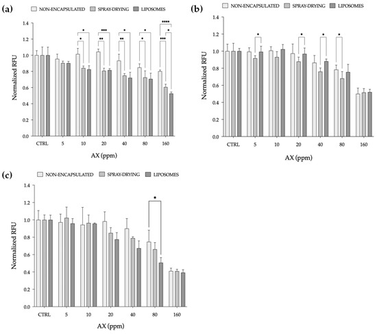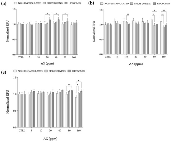 Cell viability of RTL-W1, a liver-derived cell line from rainbow trout (Oncorhynchus mykiss), exposed for 24 h to AX from natural (pigment 1) (a) and synthetic (pigment 2 and 3) (b,c) sources before and after the encapsulation processes. The results are reported as relative fluorescence units (RFUs), normalized to the control, and expressed as the mean ± standard deviation (n = 5). Asterisks denote statistical differences (* p < 0.05; ** p < 0.01) between encapsulation techniques, including the non-encapsulated form for each tested concentration.