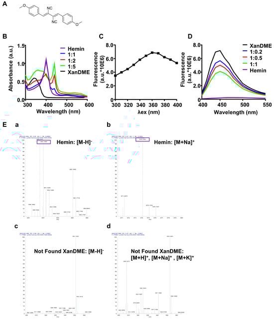 It has been reported that Xan and its derivatives possess the ability to bind with hemin, the oxidized form of heme, thereby altering its ultraviolet–visible (UV–Vis) spectral characteristics [15]. In line with these findings, hemin exhibited an absorption peak at 390 nm (Figure 1B). The addition of XanDME resulted in a significant transformation of the UV–Vis absorption spectrum of hemin, exhibiting a peak shift to 440 nm with the increased absorption in a dose-dependent manner (Figure 1B). Xan is recognized as an autofluorescence molecule, with an optimal excitation wavelength at 366 nm and emission at 414 nm [15]. To ascertain if XanDME also exhibits autofluorescence and to determine its spectral profiles, an initial scan of the excitation spectrum of XanDME was conducted, revealing an excitation maximum at 360 nm (Figure 1C), consistent with its absorption peak (Figure 1B). The emission spectrum of XanDME was subsequently identified, with a maximum at 450 nm (Figure 1D). The addition of hemin led to a dose-dependent decrease in fluorescence intensity (Figure 1D). Collectively, the observed alterations in the absorbance and emission spectra suggest a direct interaction between hemin and XanDME. This interaction was further confirmed by high-resolution mass spectrometry (HRMS) analysis of a mixture of XanDME and hemin. The analysis detected the ions of hemin ([M−H]−: 650.1389, [M+Na]+: 674.135), but none of the ions of XanDME were found (Figure 1E).