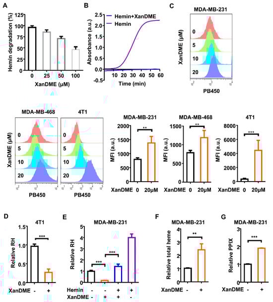 The biochemical inactivation and cellular depletion of heme upon XanDME binding. (A) Dose-dependent inhibition of the GSH-mediated degradation of hemin (25 μM) by XanDME. (B) In vitro peroxidase activity assay conducted in the presence of hemin, with or without XanDME. Hemin (5 nM) was preincubated with either XanDME (25 μM) (blue) or assay buffer (purple). The time dependent response of the hemin-promoted peroxidase activity was represented by the absorption (λem = 570 nm) in kinetic mode. (C) Flow cytometry measurements of the intracellular XanDME in TNBC cells (MDA-MB-468, MDA-MB-231, 4T1) post 24 h treatment at 5, 10, 20 μM using the PB450 channel. The data represent the average values ± SD of independent experiments (n = 3 per group). (D) The regulatory heme (RH) content in 4T1 cells measured by hemin colorimetric assay post 48 h treatment with XanDME (5 μM). (E) The RH content in MDA-MB-231 cells by hemin colorimetric assay. Cells were treated with XanDME (5 μM) for 48 h, with or without a 2 h pretreatment of hemin (10 μM). (F) The total heme content in MDA-MB-231 cells measured by fluorescence (λem = 610 nm, 660 nm) post 24 h treatment with XanDME (5 μM). (G) Porphyrin (PPIX) content in cell lysate measured by fluorescence (λex = 406 nm). MDA-MB-231 cells were incubated with either XanDME (5 µM) or DMSO for 24 h, following a 2 h pretreatment with ALA (0.1 mM) (** p < 0.01; *** p < 0.001).
