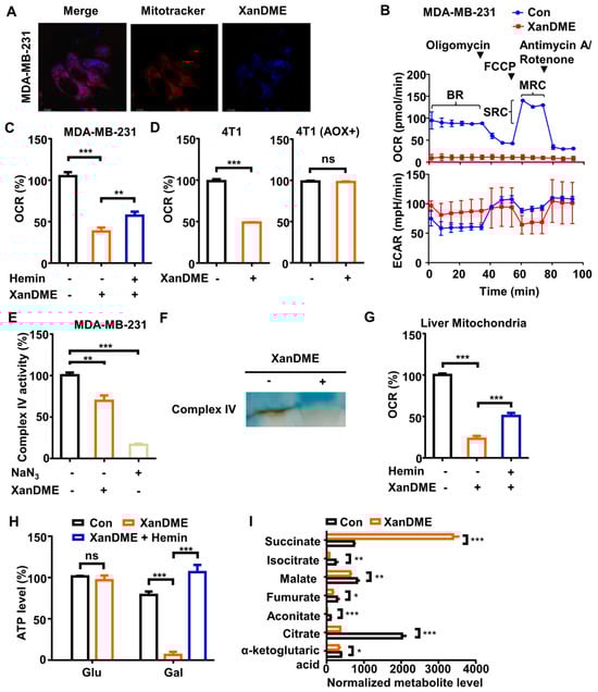 XanDME induces mitochondrial dysfunction. (A) TNBC cells were treated with XanDME (20 µM) for 24 h. Subsequently, the mitochondria were labeled with Mitotracker Deep Red. The colocalization of XanDME (blue) and mitochondria (red) was analyzed using fluorescence imaging (scale bar, 12.3 μm). (B) The oxygen consumption rate (OCR) and the extracellular acidification rate (ECAR) of MDA-MB-231 cells were measured using an XFp Analyzer following treatment with XanDME (5 μM) for 48 h. (C) The OCR of MDA-MB-231 cells were recorded using the Instech Oxygen Consumption Measurement system after treatment with XanDME (5 μM) for 24 h and pretreatment with hemin (10 μM) for 2 h. The OCR was normalized by cell number and calculated relative to the control group. (D) The OCR of 4T1 cells and 4T1 (AOX+) cells were measured following treatment with XanDME (5 μM) for 24 h. The OCR was normalized by cell number and calculated relative to the control group. (E) The mitochondrial complex IV activity of MDA-MB-231 cells after treatment with XanDME (5 μM) for 24 h. (F) The mitochondrial complex IV activity of isolated liver mitochondria after incubation with XanDME (100 μM) for 5 m by an in-gel activity assay. (G) The OCR of isolated liver mitochondria after pretreatment with XanDME (30 μM), with or without hemin (30 μM) for 30 m. (H) The ATP content of MDA-MB-231 cells grown in glucose or galactose medium after treatment with XanDME (5 μM) for 48 h, with or without pretreatment with hemin (10 μM) for 2 h. (I) The metabolites of MDA-MB-231 cells in the TCA cycle were detected by metabolomics analyses after treatment with XanDME (5 μM) for 48 h (* p < 0.05; ** p < 0.01; *** p < 0.001; ns, p > 0.05).