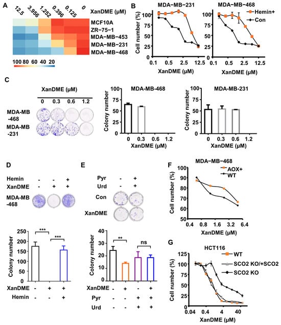 XanDME selectively inhibits cell proliferation in TNBC cells. (A) The number of various cells following 72 h treatment with XanDME at a series of concentrations. (B) The number of MDA-MB-231 cells and MDA-MB-468 cells following 72 h treatment with XanDME at a series of concentrations, with or without a 2 h pretreatment with hemin (10 μM). (C) Colony formation in MDA-MB-231 and MDA-MB-468 cells following 10 d treatment with XanDME. (D) Colony formation in MDA-MB-468 cells following 10 d treatment with XanDME (5 μM), with or without a 2 h pretreatment with hemin (10 μM). (E) Colony formation in MDA-MB-231 cells following 10 d treatment with XanDME (0.625 μM), with or without a 2 h pretreatment with pyruvate (1 mM) and uridine (50 μg/mL). (** p < 0.01; *** p < 0.001; ns, p > 0.05) (F) The number of 4T1 (WT), 4T1 (AOX+), MDA-MB-468 (WT), and MDA-MB-468 (AOX+) cells following 72 h treatment with XanDME at a series of concentrations. (G) The number of HCT116 (WT), HCT116 (SCO2 KO), HCT116 (SCO2 KO/+SCO2) cells following 72 h treatment with XanDME at a series of concentrations.