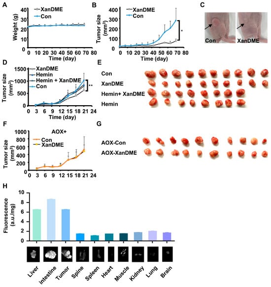XanDME inhibits TNBC tumor growth. (A) The weight of MDA-MB-231 tumor-bearing mice during XanDME treatment (5 mg/kg) via i.p. injection every two days (mean ± SEM, n = 6 independent animals). (B) Tumor growth curve of the MDA-MB-231 xenografts. Mice received XanDME (5 mg/kg) via i.p. injection every two days (mean ± SEM, n = 6 independent animals). (C) Representative images of the MDA-MB-231 xenografts in the control and XanDME treatment groups, respectively. (D) Tumor growth curve of the 4T1 orthotopic allografts in different groups (control and XanDME: n = 10 independent animals; hemin and hemin+ XanDME: n = 8 independent animals). Mice received PBS (Con), XanDME (2.5 mg/kg, i.p. injection daily), hemin (40 mg/kg, i.p. injection every two days), and a combination of XanDME (2.5 mg/kg, i.p. injection daily) and hemin (40 mg/kg, i.p. injection every two days). (E) Images of the tumors in different groups of 4T1 tumor-bearing mice at the endpoint. (F) Tumor growth curve of the 4T1 (AOX+) orthotopic allografts in different groups (n = 10 independent animals). Mice received either PBS (Con) or XanDME (2.5 mg/kg) via i.p. injection daily. (G) Images of the tumors in different groups of 4T1 (AOX+) tumor-bearing mice at endpoint. (H) Fluorescence values of XanDME in the various tissues of 4T1 tumor-bearing BALB/c mice with treatment of XanDME (2.5 mg/kg) via i.p. injection daily (n = 10 in each group) (* p < 0.05; ** p < 0.01).