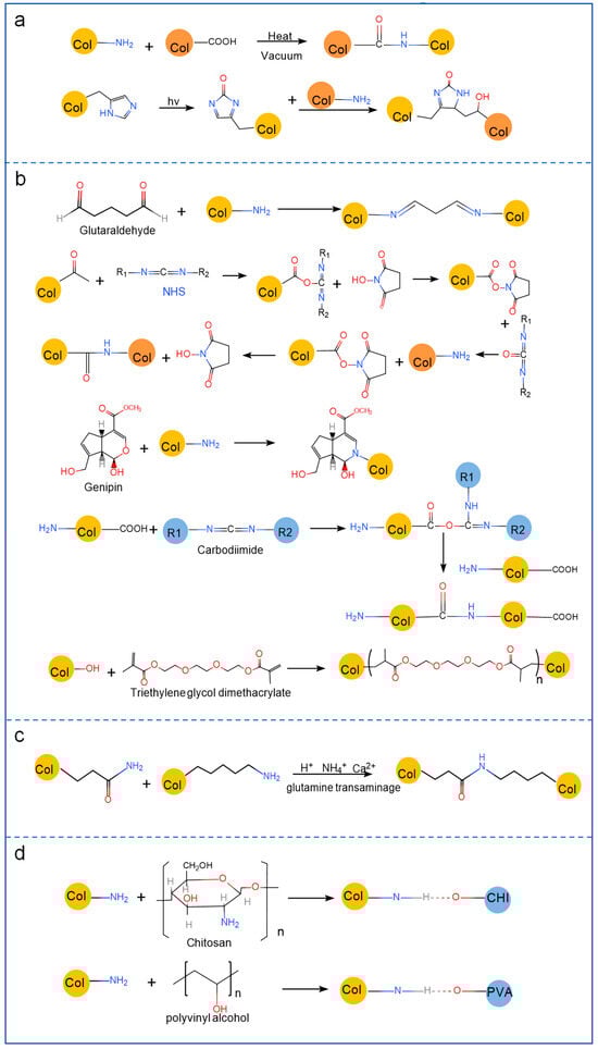 Modification methods of collagen. (a) Physical modification. (b) Chemical modification. (c) Enzymatic modification. (d) Polymer material blending modification.