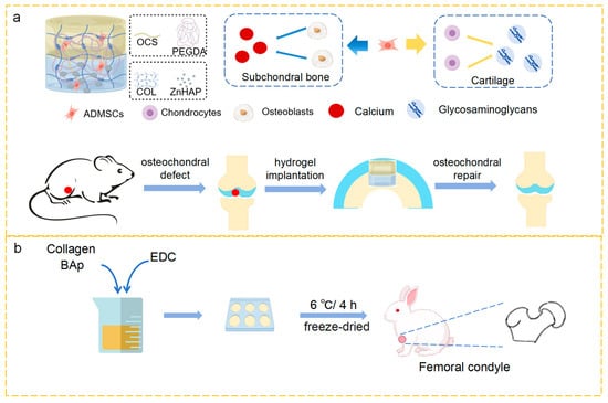(a) Schematic diagram for repairing the rat model with osteochondral defect by promoting the chondrogenic differentiation and osteogenic differentiation of the bilayer hydrogel []. (b) Schematic diagram of the femoral condylar defect experiment in which a 3D composite scaffold made of blue shark skin collagen and bioapatite is employed [].
