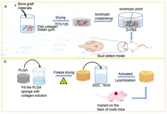 (a) Schematic illustration for bone regeneration in vivo using a biomedical membrane made of fish collagen/gellan gum containing bone graft materials []. (b) Schematic diagram of intracorporeal implantation of collagen sponge made using a porous sponge template of poly (lactic acid-co-glycolic acid) (PLGA) and collagen solution for cartilage regeneration [].