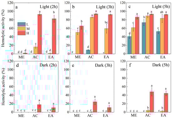 Hemolytic activities of A. sanguinea JX14 crude extracts using different organic solvents and incubated under light (a–c) or dark conditions (d–f). The incubation times were 2 h, 3 h, and 5 h. ME, AC, and EA represent methanol, acetone, and ethyl acetate, respectively. The corresponding cell densities of A. sanguinea were 100,000 cells/mL (L), 200,000 cells/mL (M), and 400,000 cells/mL (H), respectively. Results are expressed in triplicate ± standard deviation. Different lower-case letters indicate significant differences (p < 0.05).