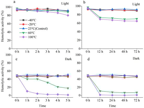 Our results demonstrated that temperature strongly affected the hemolytic activity of A. sanguinea acetone extract, with notable differences in thermal tolerance between photosensitive and non-photosensitive components (Figure 2). Under dark-incubation conditions, the hemolytic activity reduced to nearly zero after one-hour treatment at 100 °C, whereas the hemolytic activity in both the room-temperature and low-temperature groups remained relatively constant over 72 h period (Figure 2c,d), indicating that the non-photosensitive toxins in A. sanguinea should be thermally unstable. In contrast, the hemolytic activity in the 100 °C treatment group under light incubation dropped by just 10% at 5 h (Figure 2a) and maintained at 70% at 72 h, despite a significant decline at 12 h (Figure 2b). There were no significant differences between the room-temperature and low-temperature treatment groups, whenever under dark incubation or light incubation (p < 0.05). This experiment demonstrated that, although photosensitive toxins may lose some of their activity at high temperatures, their overall stability is much higher than that of non-photosensitive toxins.
