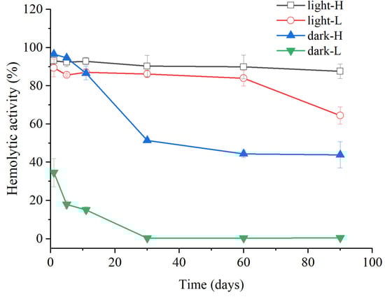 The hemolytic activity of the crude extract from A. sanguinea was also significantly affected by light exposure. After a 3 h period of light treatment at 100 µmol/(m2·s), the hemolytic activity under dark incubation dropped to nearly zero, whereas the hemolytic activity under light incubation remained basically unchanged compared with the level before treatment (Figure 3). The observation suggested that the photosensitive components have higher photostability, while the non-photosensitive components may undergo degradation or structural alterations when exposed to light, resulting in reduced hemolytic activity. Similarly, studies have shown that the acute toxicity of cell-free filtrates of P. parvum to fish diminished markedly after a few hours of full sunlight exposure [52].