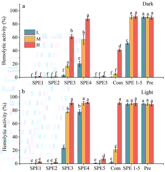 Hemolytic activity of SPE fractions of A. sanguinea JX14. The corresponding cell densities of A. sanguinea were 800,000 cells/mL (L), 1,200,000 cells/mL (M), and 1,600,000 cells/mL (H). (a): Dark incubation (5 h). (b): Light incubation (5 h). Combination (Com) represents a mixture of 200 µL of each SPE fraction; SPE1-5 represents a mixture of 1 mL of each SPE fraction, dried under a nitrogen stream and redissolved in 1 mL of ethanol; Pre represents acetone extract of A. sanguinea cells. Results are expressed in triplicate ± standard deviation. Different lower-case letters indicate significant differences (p < 0.05).