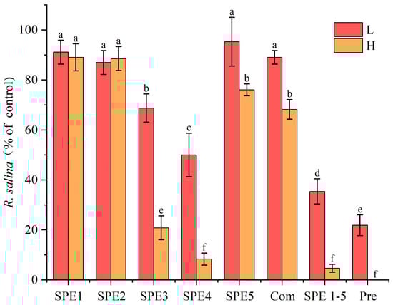 Inhibitory effect of SPE fractions of A. sanguinea on R. salina at 72 h. The corresponding cell densities of A. sanguinea were 2000 cells/mL (L) and 4000 cells/mL (H), respectively. Com, SPE1-5, and Pre are the same as in Figure 5. Results are expressed in triplicate ± standard deviation. Different lower-case letters indicate significant differences (p < 0.05).
