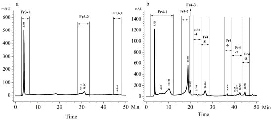 The results of reversed-phase high-performance liquid chromatography (RP-HPLC) separation and purification using SPE3 and SPE4 fractions of A. sanguinea are shown in Figure 7. Three fractions (Fr3-1 to Fr3-3) were collected from SPE3 (Figure 7a), while eight fractions (Fr4-1 to Fr4-8) were obtained from SPE4 (Figure 7b) (indicated by arrows in the chromatogram).