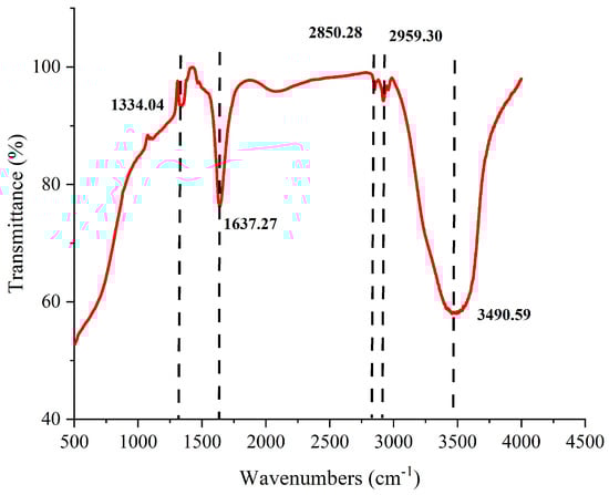 The Fourier transform infrared (FTIR) spectrum of fraction Fr4-5 displayed several prominent absorption peaks (Figure 10), revealing the presence of various typical functional groups within its molecular structure. The broad absorption peak at 3490 cm−1 is typically associated with the -OH stretching vibration, suggesting the presence of hydroxyl groups. The peaks at 2959 cm−1 and 2850 cm−1 are attributed to the C-H stretching vibrations, indicating the presence of alkyl chains or similar structural units. The peak at 1637 cm−1 is commonly associated with the bending vibration of C=C double bonds, suggesting the presence of aromatic rings or nitrogen-containing groups. The absorption at 1334 cm−1 may be attributed to C-N or C-H bending vibrations, which are typically observed in nitrogen-containing organic molecules. Overall, the absorption features in the spectrum indicated that the fraction Fr4-5 contained a range of typical organic functional groups, such as hydroxyl, alkyl, and aromatic or nitrogen-containing structures.
