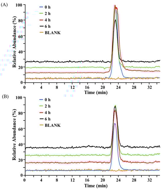 The total ion chromatogram (TIC) of BG136 after digestion in (A) simulated gastric fluid and (B) simulated small intestinal fluid for 0, 2, 4, and 6 h, respectively.