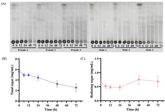 Changes in saccharides during fermentation. (A) The thin-layer chromatogram of BG136 in vitro fermentation for 0, 6, 12, 24, 48, and 72 h. Changes in (B) total sugar and (C) reducing sugar contents during fermentation (n = 6).