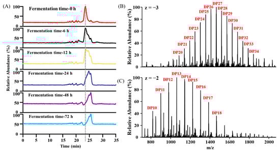 HPSEC-MS detection of fecal fermentation samples. (A) The TIC of BG136 fermented for 0, 6, 12, 24, 48, and 72 h, respectively. Backward shift of peak was indicative of hydrodynamic volume reduction. (B) Primary mass spectra of the chromatographic peak at 0 h [M − 3H]3−. (C) Primary mass spectra of the chromatographic peak at 72 h [M − 2H]2−. Decrease in mass-to-charge (m/z) ratios and charge state (z) transition from −3 to −2 represented molecular weight diminution. DP: polymerization degrees.