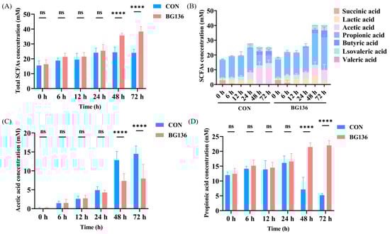 Assessment of the impact of BG136 on the generation of SCFAs. (A) Changes in total SCFAs concentration during fermentation. (B) The production levels of SCFAs in different time duration, especially (C) acetic acid and (D) propionic acid (n = 6). ns: p > 0.05, ****: p < 0.0001.