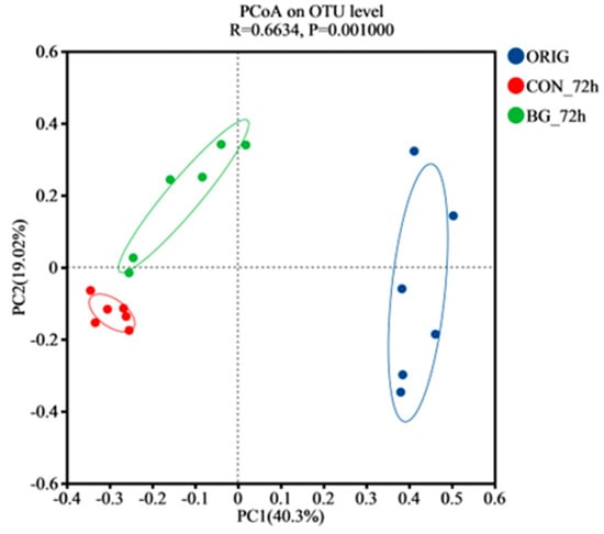 The principal co-ordinates analysis (PCoA) of gut microbiota of the samples. ORIG: the initial gut microbiota without fermentation; CON_72h: fermentation without carbohydrate addition for 72 h; BG_72h: fermentation with BG136 supplement for 72 h.