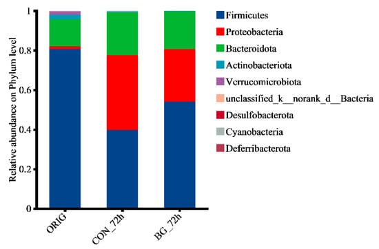 Furthermore, community composition across groups was comparatively analyzed at both phylum and genus levels to visualize specific changes within the gut microbiota. As shown in Figure 6, in the original fecal samples, the phylum with the highest proportion was Firmicutes, followed by Bacteroidota. Additionally, the samples fermented for 72 h (CON_72 h and BG_72 h) exhibited a higher proportion of Proteobacteria and a lower proportion of Firmicutes. This could be attributed to the fact that the in vitro fermentation process is not a strictly anaerobic environment, and Proteobacteria are facultative anaerobes, while Firmicutes are strictly anaerobic [].